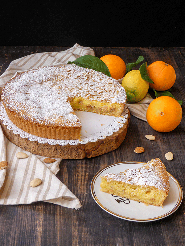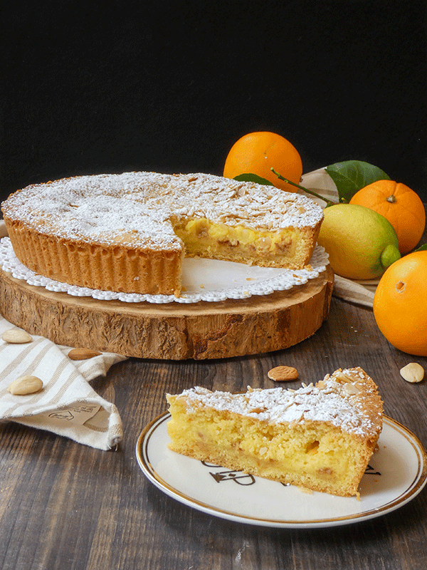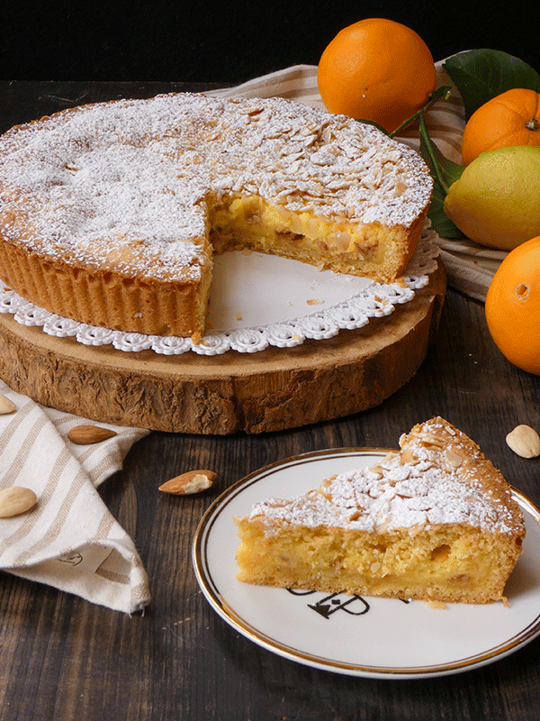 Una torta semplice, un guscio di frolla che racchiude una golosa crema pasticcera all’arancia e amaretti sbriciolati.