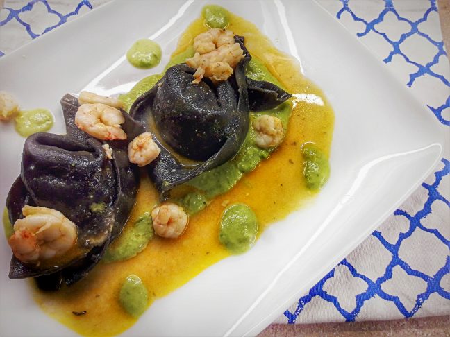 Le temperature miti dei giorni scorsi hanno ispirato questa ricetta dal sapore primaverile: cappellacci di cernia Pasta Fresca Poggiolini con bisque di gamberi ( fumetto) su macco ( crema di fave) di fave fresche.